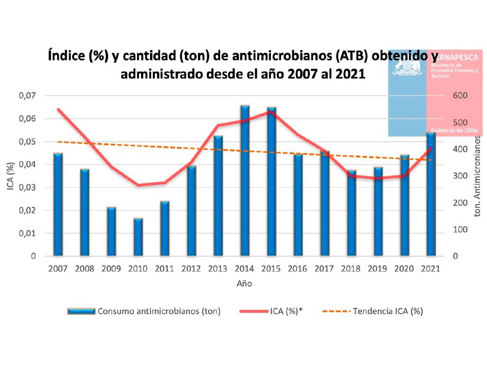En Chile, de acuerdo a la publicación de Millanao et al. 2018, el 95% de tres grupos de antibióticos que se importaron al país entre 1998 y 2015 fueron destinados a uso veterinario, principalmente a salmonicultura. Así, en comparación a otros de los principales países productores de salmón, como Noruega y Canadá, la industria chilena es la que más antibióticos utiliza por tonelada de salmón producida.