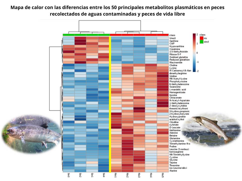 Acuicultura. Mapa de calor con las diferencias entre los 50 principales metabolitos plasmáticos en peces recolectados de aguas contaminadas y peces de vida libre